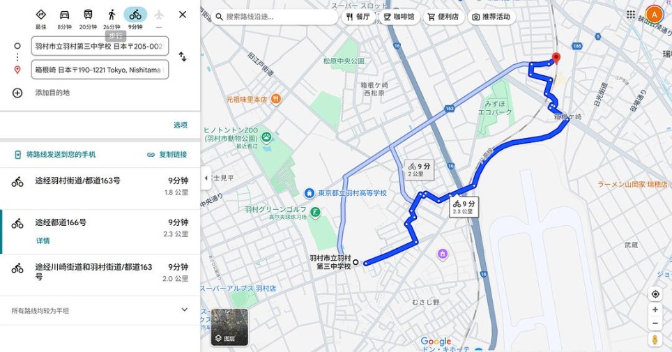 那么问题就只有:从哪里向北走去车站会经过基地呢?虽然范围已经显著缩小到离基地较近的几所中学,但遗憾的是,按谷歌地图导航向湘南海岸的最方便路线,并没有哪所学校的学生真的需要向北途径基地边才能到达车站。不过,考虑到铁丝网和军事基地的意向是渡边有意加入,逃学的主人公们绕个小远也属合理,那还是可以找出一个相当合理的备选对象:東京都立羽村高等學校。从这里出发,向北沿着基地正好可以走到箱根崎站,再坐两站八高线就能到达换乘青梅线的拝島。