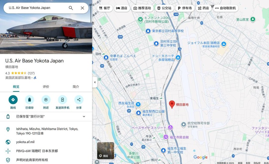 再一看地图:这个区域里真的有基地!U.S. Air Base Yokota Japan(横田空军基地)就坐落在福生/羽村这两个jr车站旁边。