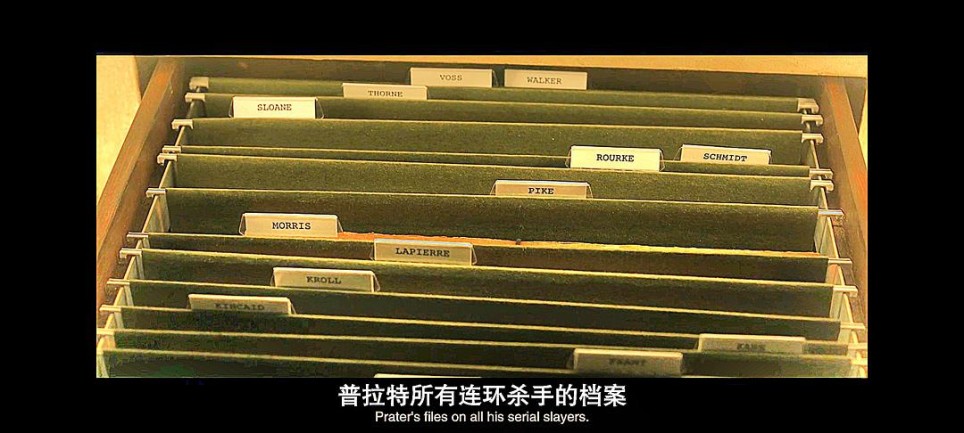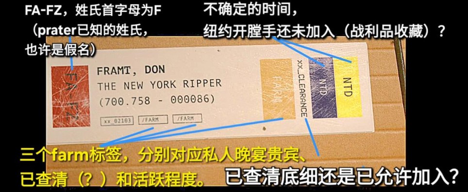 don framt是prater已知的纽约开膛手姓名。 如果纽约开膛手是jonah mitchell,那要么是他在父母、妹妹死后从安全屋逃出,更名改姓去纽约,要么他像dex一样用假名欺骗了prater。 关于三个"farm"标签,由于纽约开膛手已经有五年没有杀人了,只是打电话恐吓受害者家属,我有好几种可怕的猜想。 一是纽约开膛手没有答应加入prater的组织,但是prater一直资助(养育)他,或者,在观察他,等待他回心转意。 二是纽约开膛手已经和prater达成协议,但没有给战利品(所以时间栏是ntd),四处物色受害者饲养,准备搞大屠杀,把最完美的战利品提供给prater。 我更倾向于don framt是个假名,因为编剧不可能让claudette太快破案。从档案标签的磨损程度来看,也许纽约开膛手一直没有答应加入组织,让prater对他有很深的执念,经常拿出来看。