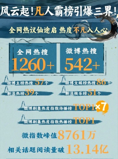 剧版《凡人修仙传》开播⾸⽇热度达8326,创下优酷2024年以来开播⾸⽇热度最⾼纪录;播出第三天热度值即破万。