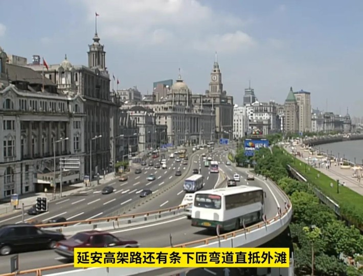 当时延安高架路还有条下匝弯道直抵外滩,这里偏偏是看外滩最漂亮的地方,当时人们把延安路高架称为“亚洲第一弯”。