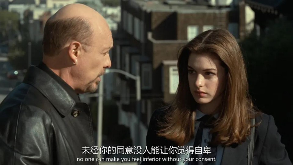 故事开始的安妮海瑟薇,完全社恐一枚,在学校里头也只有一个怪咖死党,说白了,在学校就是被边缘化的一个。