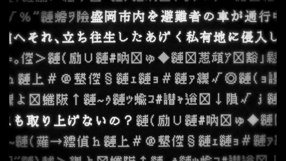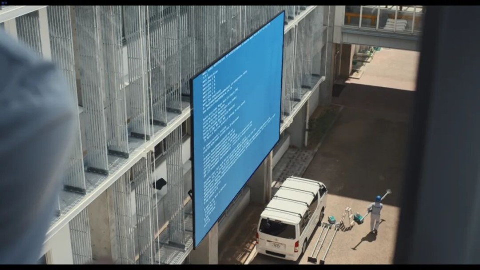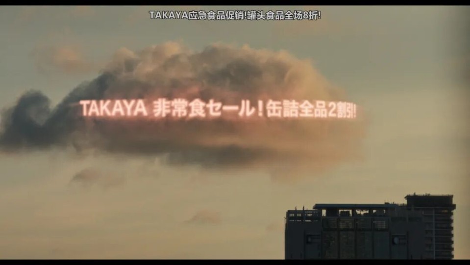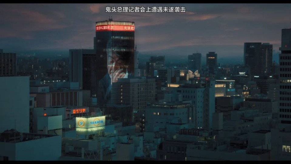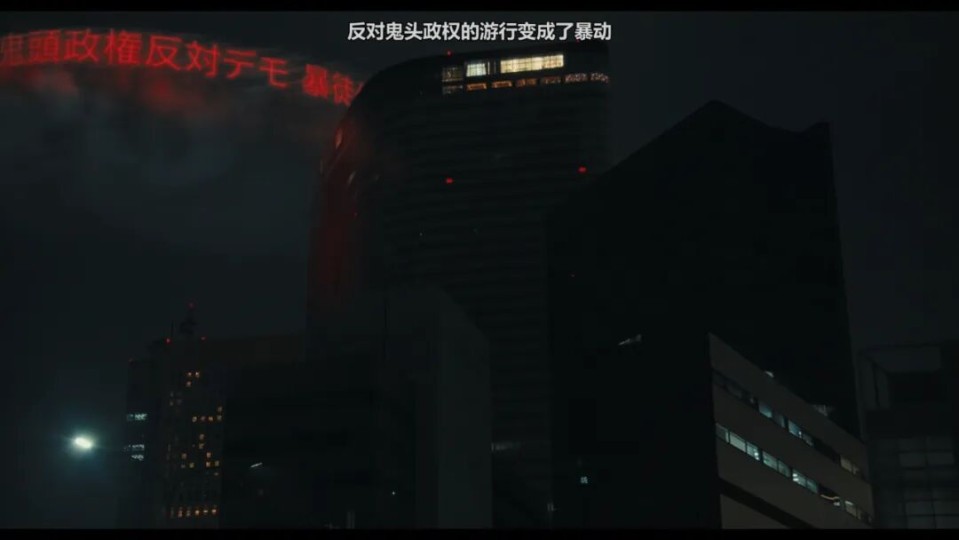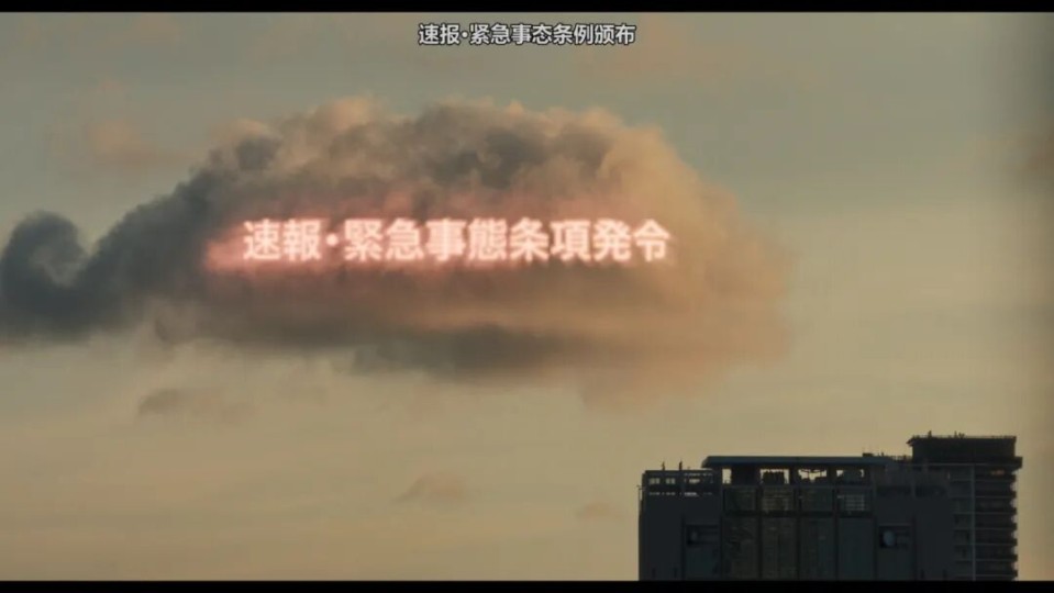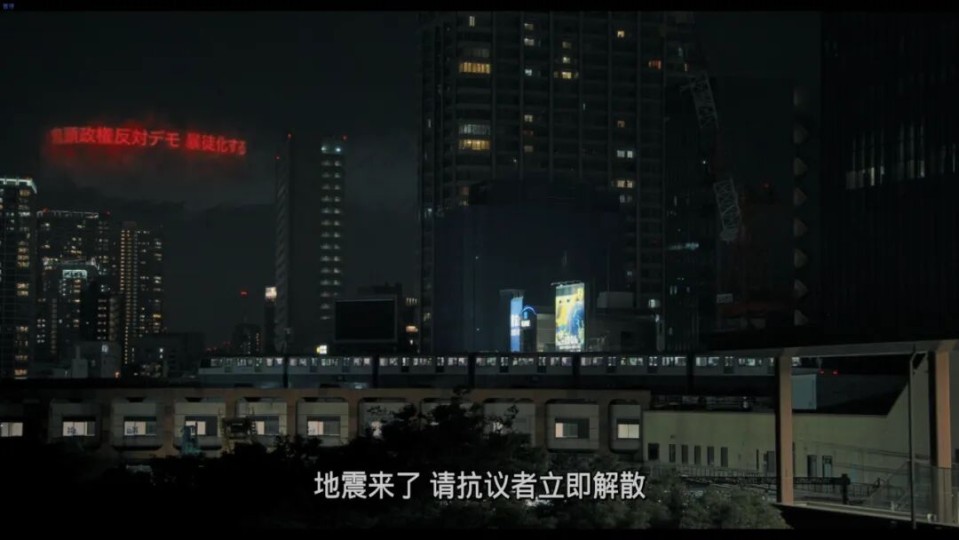 伴随着叙事推进,“庞大高楼”在云雾里偶尔显形。当权的鬼头首相召开记者会,为增大内阁权限要修改宪法,理由是日本将要发生“百年一遇”的大地震。以这个看不见的未来灾难为理由,宣布启动“紧急事态”。视觉上,国会和首相都只存在于屏幕里,餐厅的电视屏幕、商业楼外壁的巨大LED屏幕。对当权者,普通人只能看却碰不到。