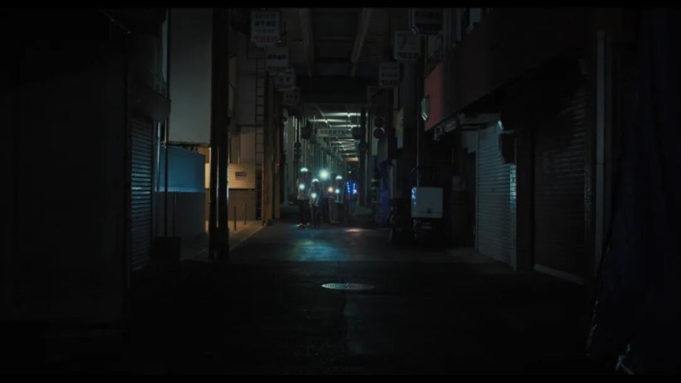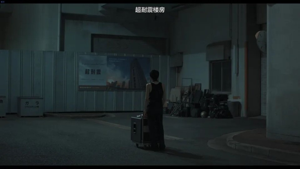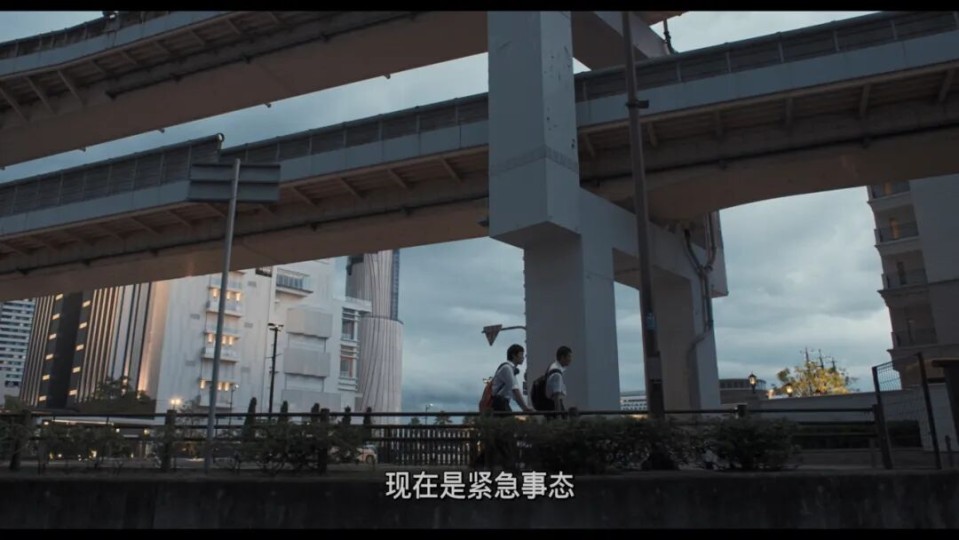 视点不明的空镜,作为全片第一个镜头,定下世界的基调,呼应着开场前的字幕——“试图将人们框进旧有框架的声音喧嚣不已,风化的庞大高楼比往常更加摇摇欲坠。日本那曾经划分人种的体系正在崩塌,似乎有什么巨大的变化将要发生。”向下飞速的甩镜头,视觉上无从判断物理距离,感官上就是“高到天际”,观众由此感受到人们都在“庞大高楼”之下生活。