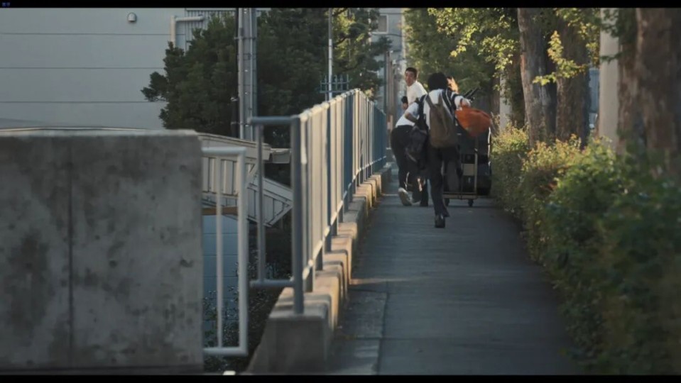 整部电影,有一条若隐若现的叙事线索:悠太一直在失去——失去空间据点、失去同路朋友、失去寄居的家,最后只剩下音乐。饶有意味的一幕发生在他们几人的“音乐研究部”被取缔后,先是五人合力偷走了音响设备,从学校一路推着音响功放,狂欢着入驻到空置的单位里;而后是悠太与光——这对发小儿——推着低音炮一路经过毫无特征的城市景观:立交桥、水泥板楼、无尽的坡道、分叉再分叉的过街天桥……最后光被迫带警察回家证明自己身份,只剩悠太一人西西弗斯般地推着器材,直到终点,他才发现他们精心布置的音乐据点被清空。他独自一人面对着被搬到外面的器材,此刻,他或许意识到自己已经被剥夺得一无所有。这也为高潮段落埋了伏笔——从来都回避政治、一心沉醉在音乐里的悠太突然挺身而出——维护了同学们的“革命果实”,而他也为此失去学籍,进而失去了母亲的庇护,不得不早日投身社会洪流。