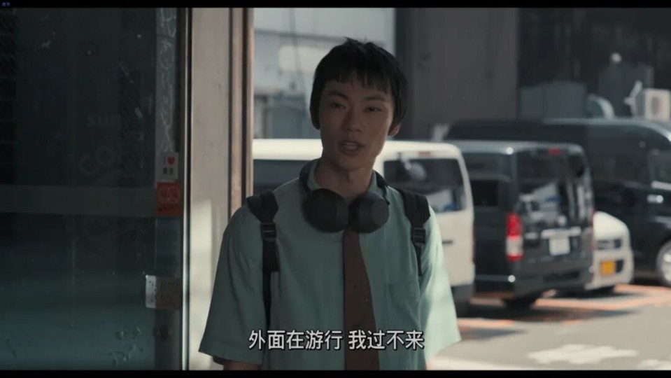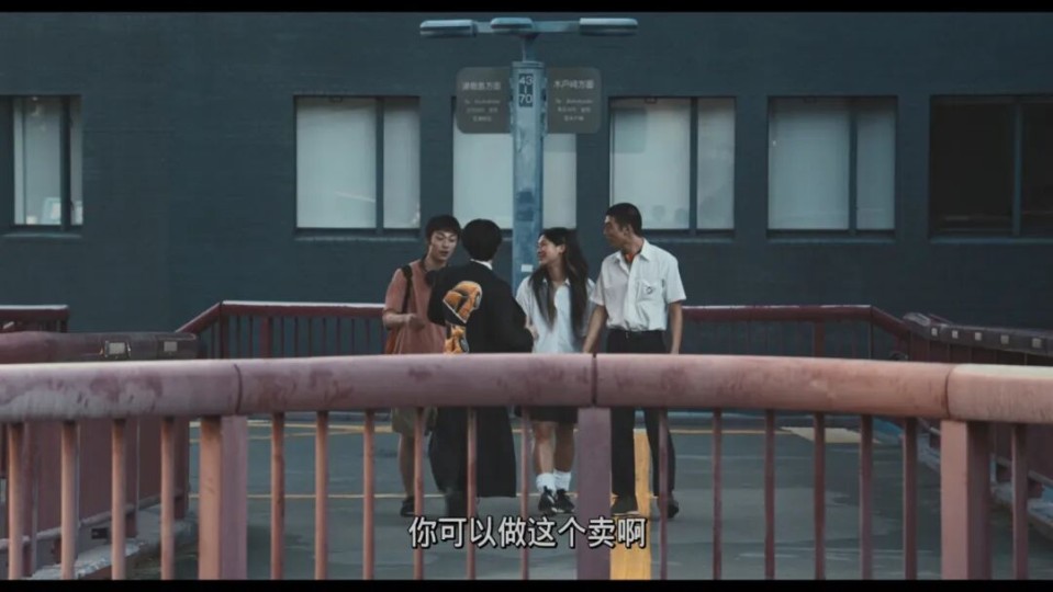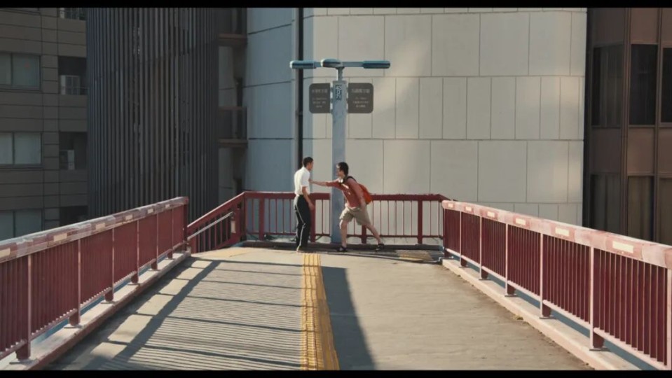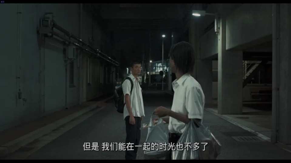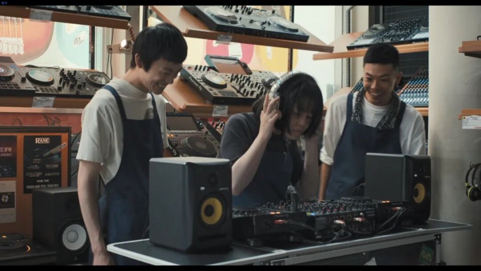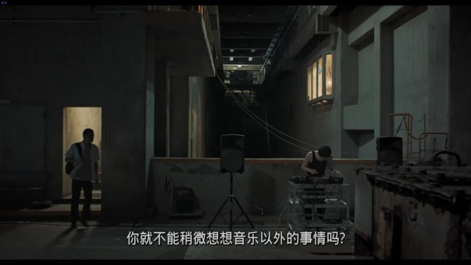 巨楼之下,是一个“入场”的情境。高中生想混进live house,真正拦住他们的并不是邀请码和年龄限制,而是语言。结合前一个镜头,在高不可及的高楼下,Live house无异于“巴别塔”的入口。从日文到蹩脚普通话再到英文,横在高中生面前的是交流的天堑。他们还是混了进去,听得忘我。当悠太和光被警察盘查时,那个明显不是日本人的DJ,竟主动把装着音乐的u盘送给了悠太,音乐无界。