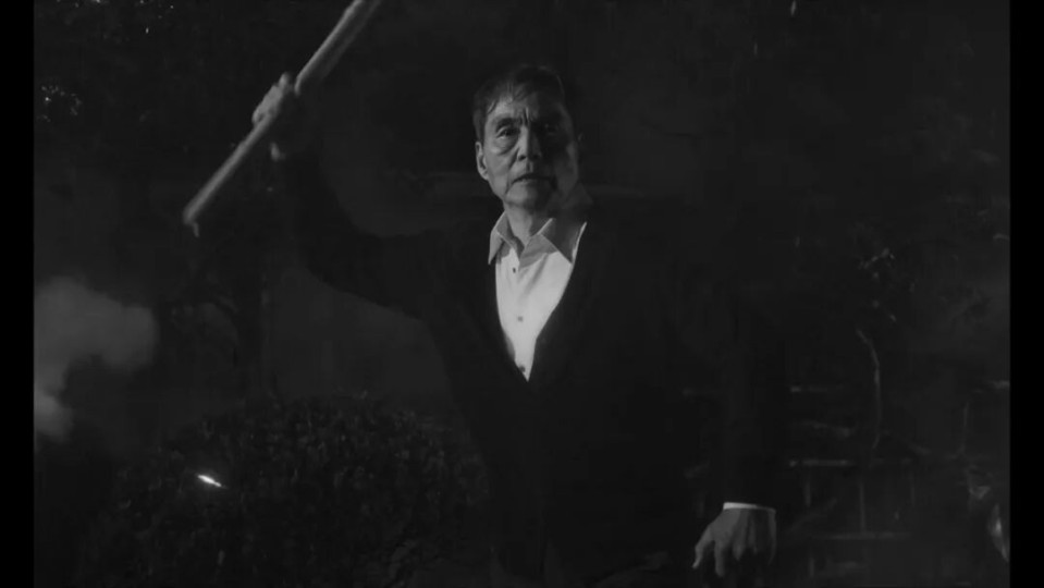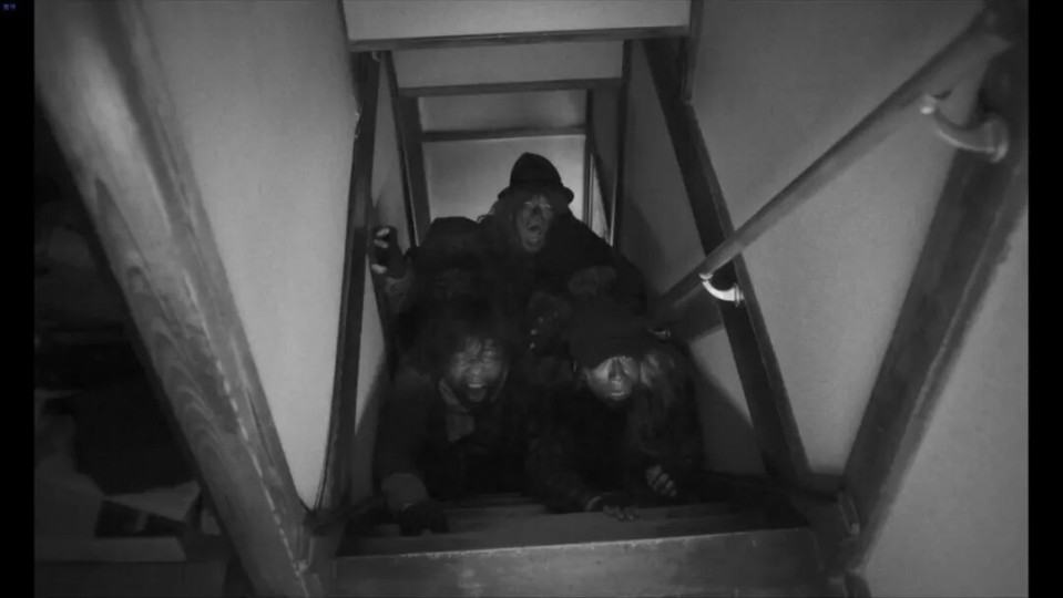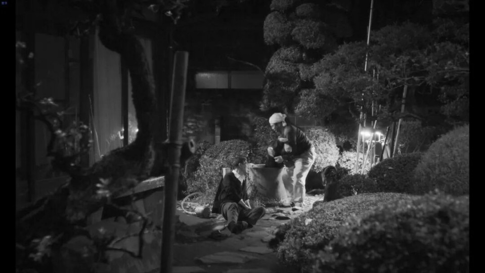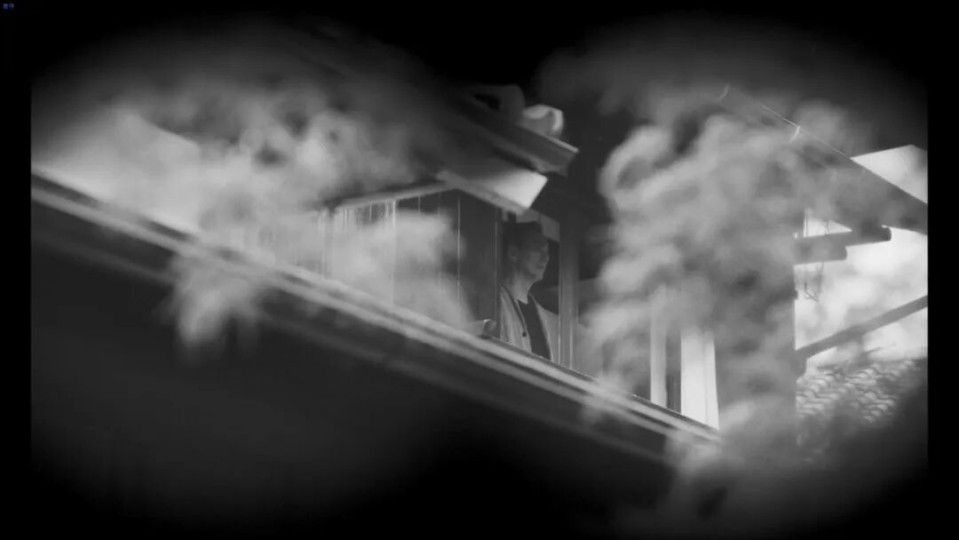可以说,“敌”是以老人自己的存在和感知为前提的,没有他,就没有敌。视觉上,这一无所从来的威胁,是以饥民的形象出现的。如果说,“敌”代表了日益临近的死亡,那么具象化的“敌”以一群饥民暴徒的形象,折射出老人真正恐惧的是“被剥夺”。他守不住专栏、守不住女学生、守不住好友、守不住对亡妻的思念,甚至守不住内心的情欲,这一切都与“饥民形象”的敌相匹配。最后,自家庭院被敌人占领,老人被迫壮烈迎战,中枪倒地。紧接着,真实状态的他,安静地迎接死亡。尾声有一处看似闲笔的设计:按老人遗嘱,表兄之子接手宅院。这人在库房里找到望远镜,无聊扫视,却在望远镜里看到宅子二层渡边老人正凭窗远望。视觉上,老人仍然居于宅子的主人地位,他的魂灵死守着这一空间。