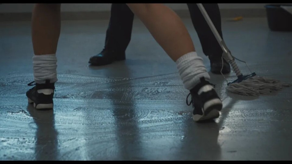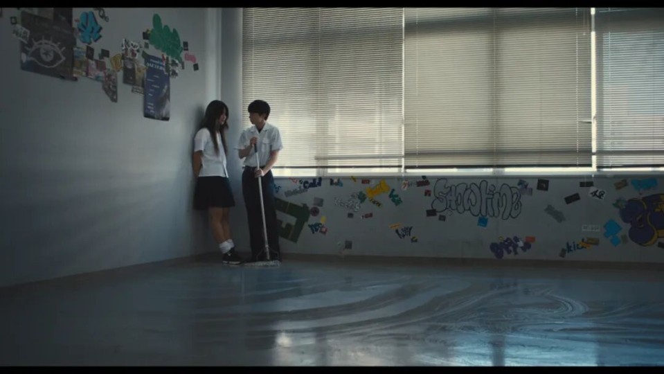 影片当然不是命题作文式的批判,作者在被挤压的空间里也注入了人情。高中五人组里有一对情侣,男生被罚清扫音乐研究部,女生过去找他开玩笑。男生刚刚拖过的地板又被踩脏,于是男生不得不重新拖,可他又怀着情愫乱了方寸,就这么一股脑拖下去,以至于能站立的地面越来越少,最后他和她只能挤在一角,等待整个屋子的地板干透才可走动。这一幕设计,浪漫地拉近这对情侣的距离,同时又在视觉上点明——他们(也包括好友们)的空间被剥夺、被挤压到无立足之地。