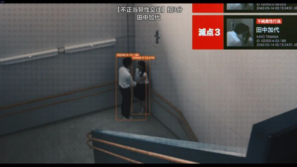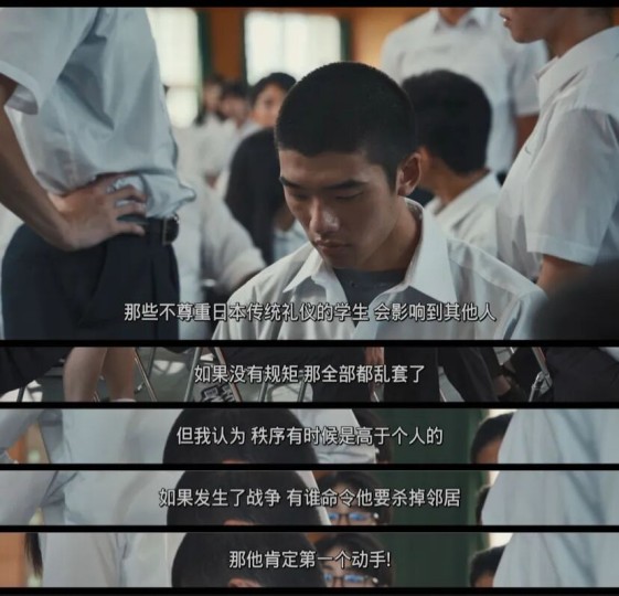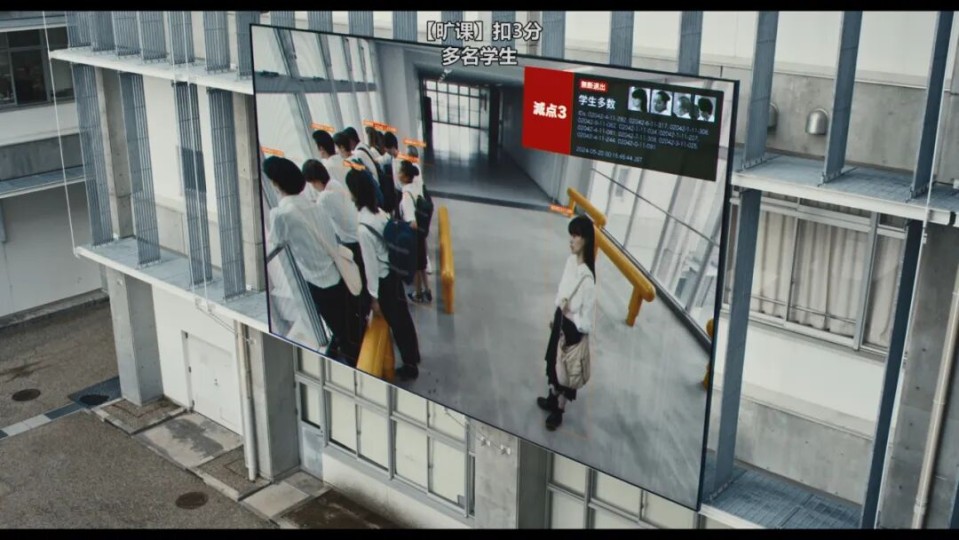 云、校园监控评分系统和城市里的高楼、立交桥、水泥板教学楼、抗震建筑一样,都是开场字幕所提到的“庞大高楼”的视觉符号。鬼头首相——校长——警察——自卫队军人,他们和前面的视觉符号互为表里,以言行、视觉的双重形式,压迫着高中生的青春。