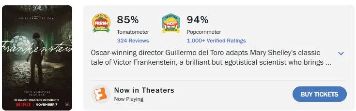 △ 《弗兰肯斯坦》烂番茄的新鲜度为85%,爆米花指数94%